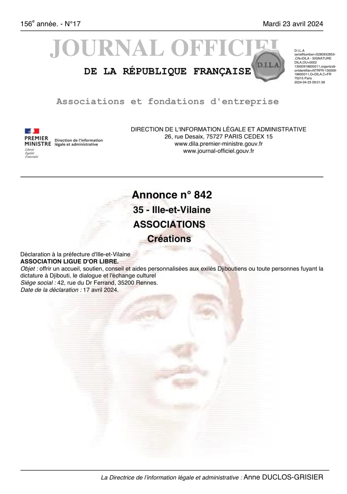 Nous avons le plaisir de vous informer que notre association Ligue d’Or Libre figure désormais officiellement dans le Journal Officiel de la République Française, en date du 23 avril 2024. ![]()